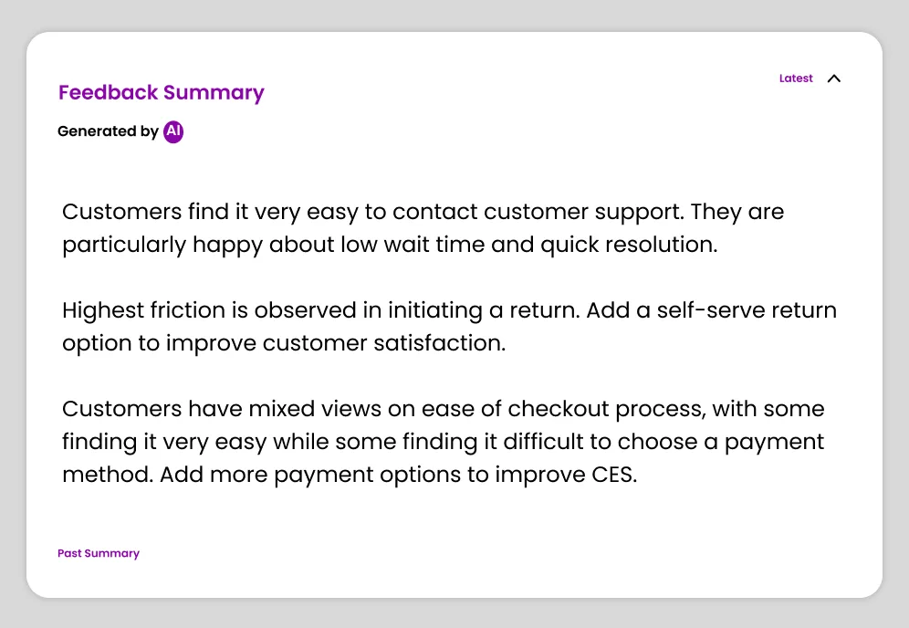 Save time and effort by going through an AI-generated summary of all customer feedback. Understand what low-effort customers like and what high-effort customers dislike. Get clear focus areas and act on them to improve customer experience.