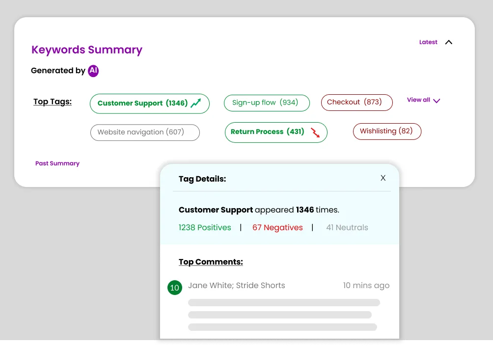 Get a clear summary of keywords customers are talking about. For each keyword, know the overall customer sentiment – positive, neutral, or negative. Prioritize areas related to top negative keywords to reduce customer effort.